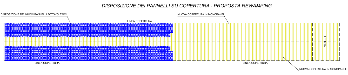 Abbiamo proposto la sostituzione di tutti i vecchi pannelli con nuovi pannelli a tecnologia cristallina ad alta efficienza. Mentre gli inverter non verranno sostituiti in quanto, salvo vizi occulti, sono adeguati per il dimensionamento dei nuovi pannelli.