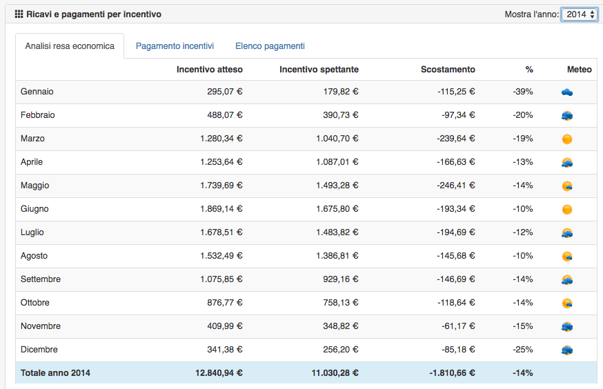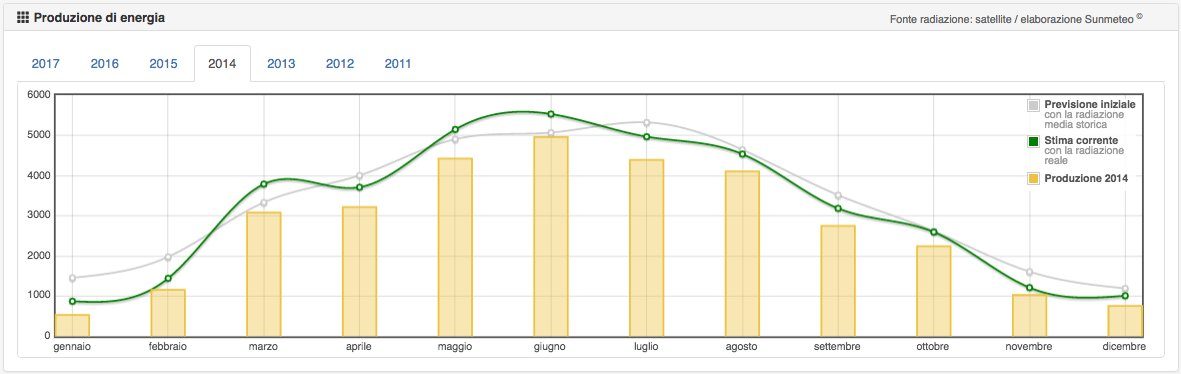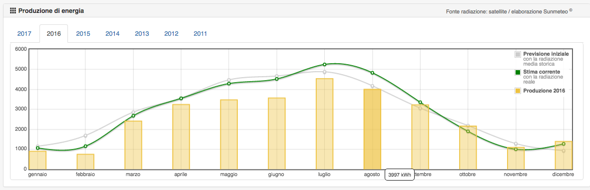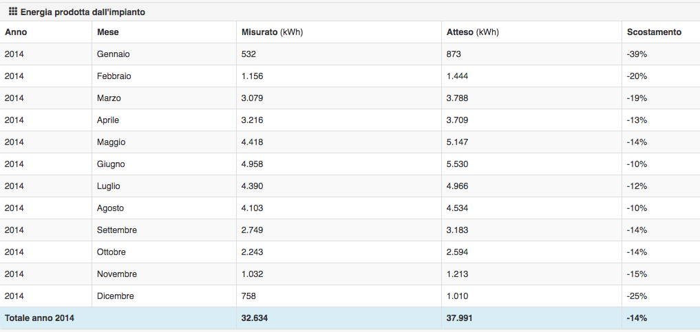 La produzione dell’impianto FV nel periodo Maggio-Agosto è ogni anno calante rispetto alle reali condizioni meteo rilevate, mentre nei restanti mesi la produzione è ottima. La predita economica media è di € 200/anno.