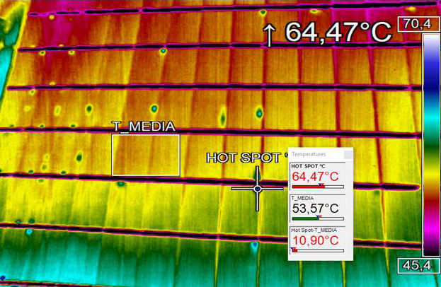 Una delle più subdole problematiche è il calo di produzione dovuto agli hot spot (punti caldi) delle celle dei pannelli fotovoltaici, difficili da individuare senza una termo-camera. Impianto Fotovoltaico in questione è su edificio industriale della potenza di 40 kwp, parzialmente integrato in secondo conto energia installato su unica falde sud.