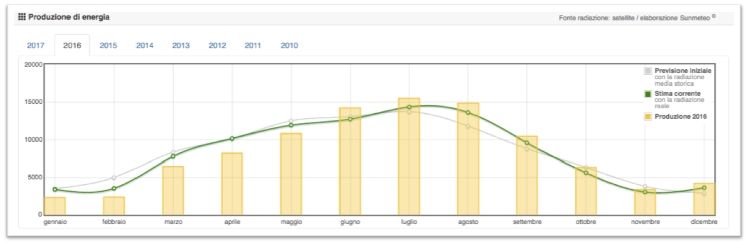 L’impianto fotovoltaico è da 100 kW, con un calo di rendimento pari a € 4.500,00 negli ultimi 12 mesi. Dopo la pulizia come evidenziato dalla freccia rossa, la produzione aumenta a tal punto che l’intervento di pulizia da giugno 2016, ha dato un profitto maggiore del 10% pari a € 6.000 €, costo dell’intervento di pulizia periodica € 900,00.